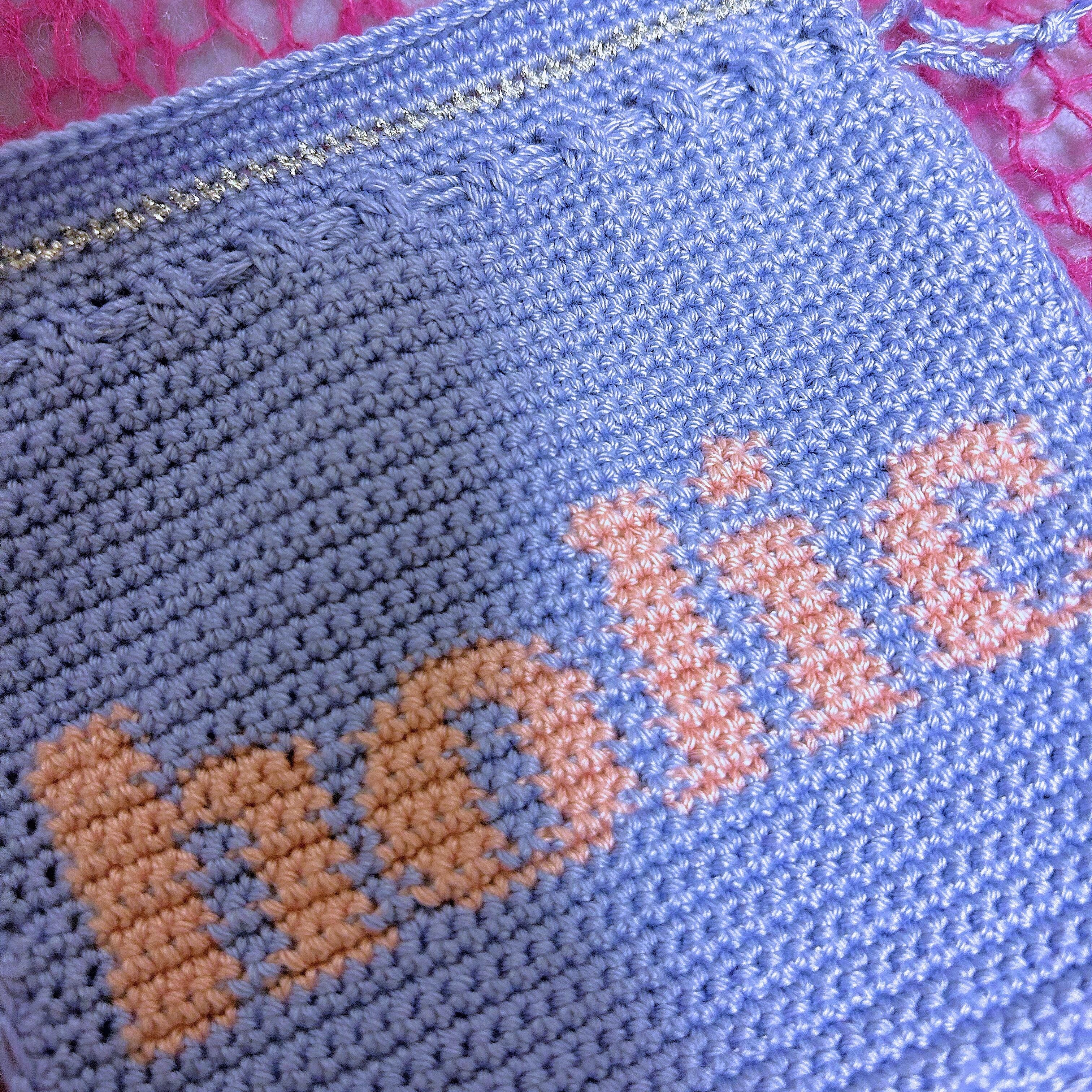 パステルブルーのような、ラベンダーのような、淡い青紫カラーをベースに、コーラルピンクの文字を編み込んでいます。